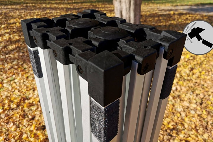 O tempo total para montar a tenda é de apenas alguns segundos. Num instante, cria um espaço totalmente protegido com o pavilhão promocional. Componentes cuidadosamente desenhados facilitam o desdobramento da própria tenda. É tão simples como abrir um guarda-chuva. Pensámos em poupar tempo, muito valioso antes de vender ou apresentar. Ninguém quer perder tempo; todos queremos fazer tudo rapidamente para nos concentrarmos na venda em si.