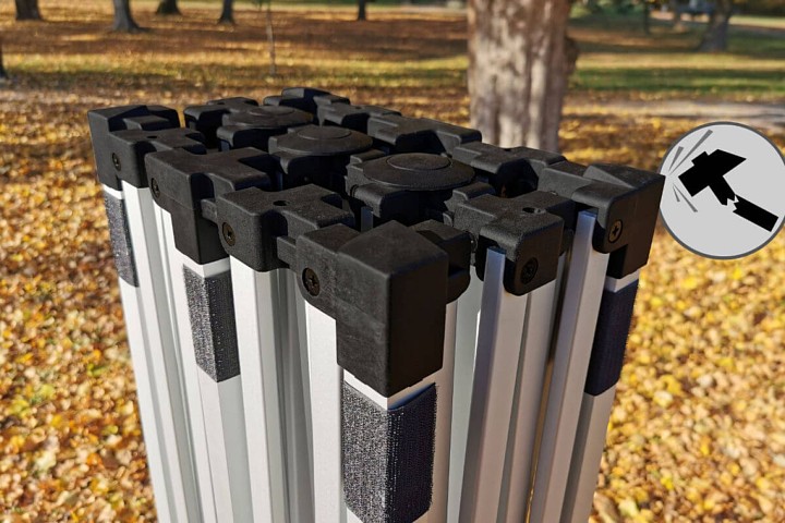 A tenda publicitária pode ser usada tanto ao ar livre quanto em ambientes internos. Não negligencie a segurança da tenda. Deve sempre ser ancorada em qualquer condição climática. O pacote contém estacas para fixação. Se você montar a tenda em uma superfície dura, pode usar pesos de aço ou sacos de areia. Como fixação adicional, os clientes utilizam corda com estacas, também disponíveis como acessórios para a tenda.