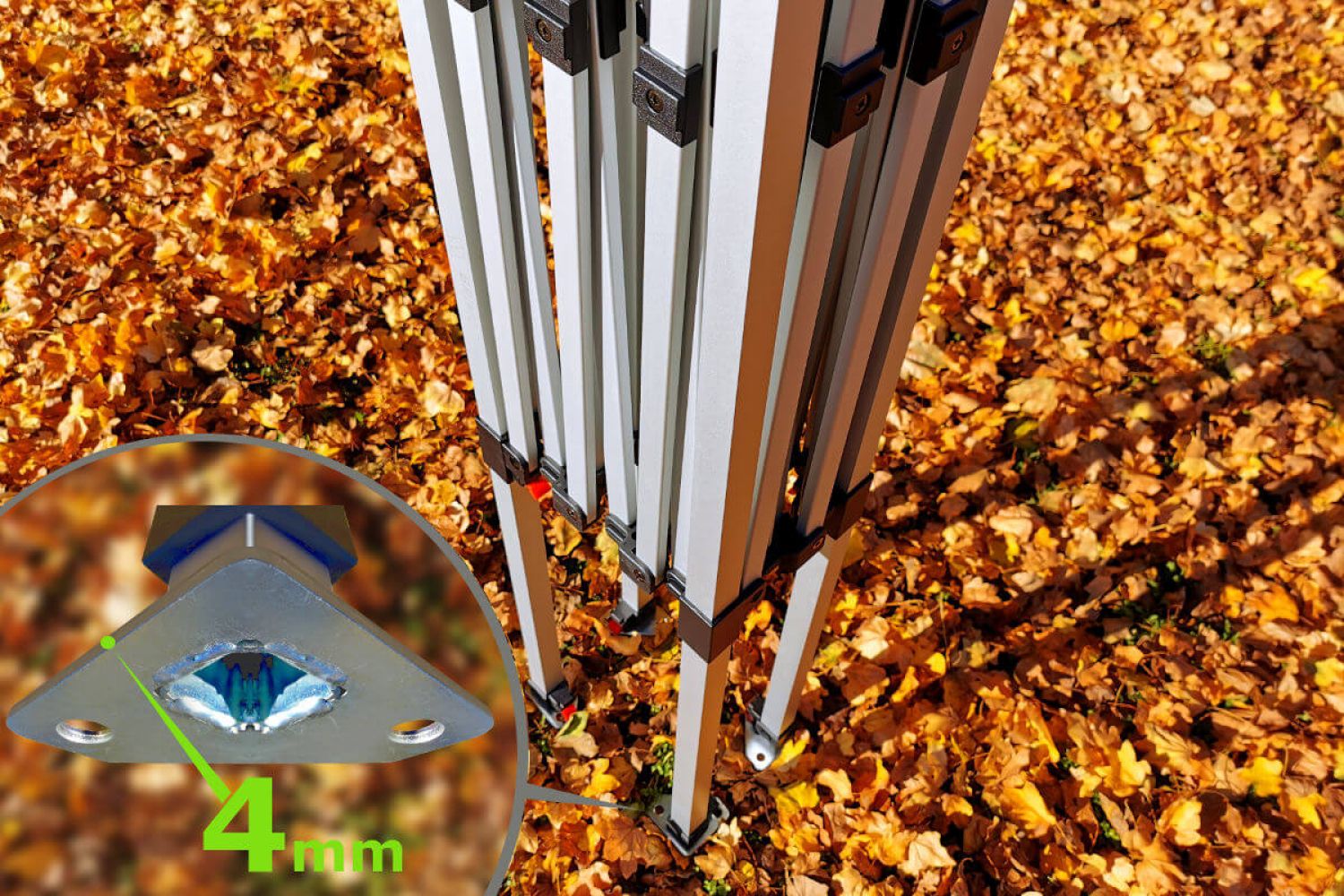 Graças ao seu baixo peso, que irá apreciar durante o transporte, a tenda pode ser facilmente movida para onde precisar. A estrutura sólida de alumínio suporta ventos de até 60 km/h. Em caso de rajadas mais fortes, recomendamos remover as paredes da tenda (se houver) e baixar a altura da tenda ao nível mais baixo. A tenda pode ser usada tanto no interior como no exterior, em qualquer época do ano.