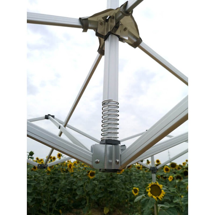 A base é constituída por um mecanismo inovador em tesoura, que assegura uma montagem sem problemas e ultra-rápida da tenda. Quando fechada, a estrutura mede apenas 2 metros, o que simplifica significativamente a logística e o transporte. A estrutura utiliza pernas hexagonais maciças, tornando o conjunto extremamente estável. No entanto, lembre-se que uma fixação rigorosa é crucial – para segurança absoluta, mesmo os modelos mais robustos devem ser sempre fixados de forma fiável ao solo.
