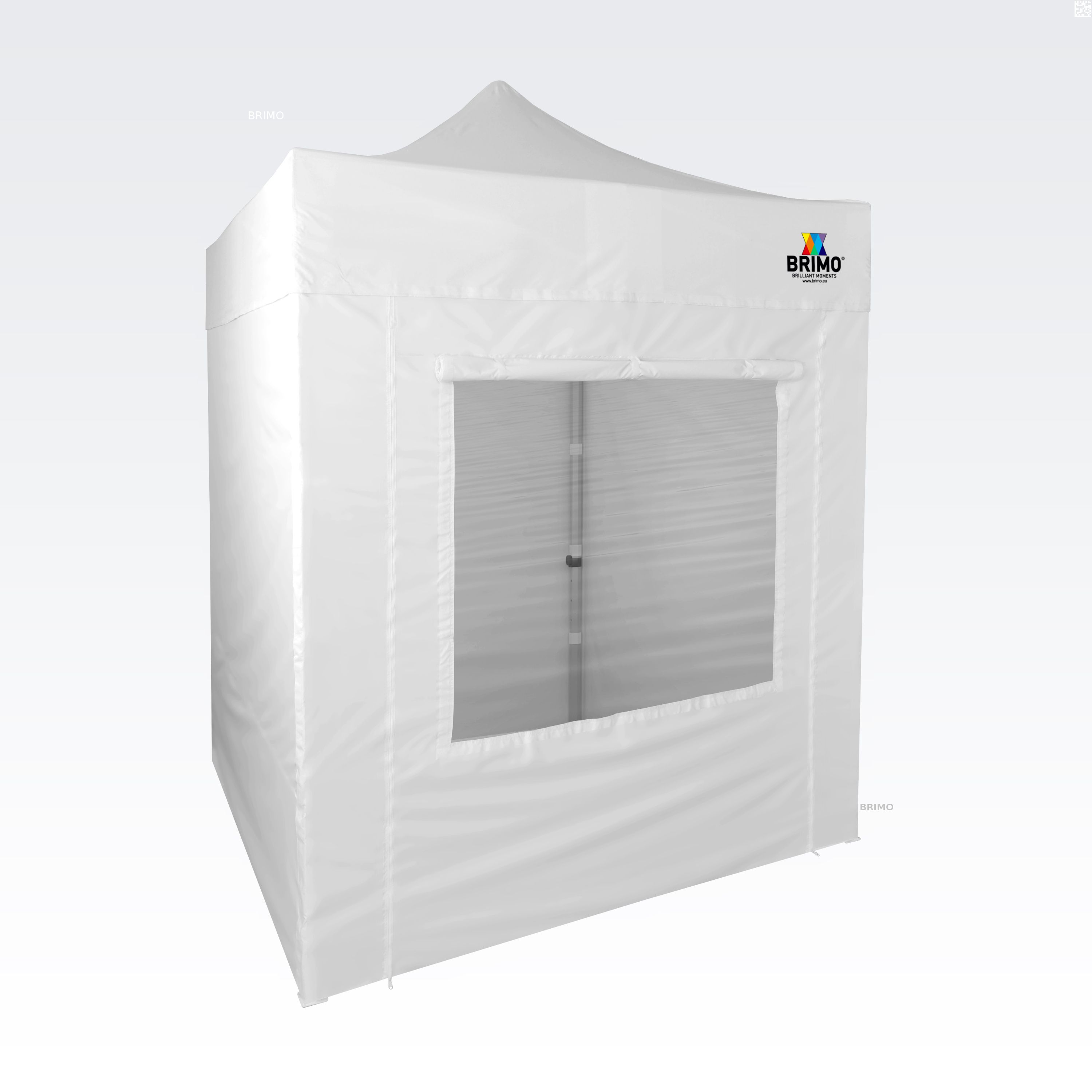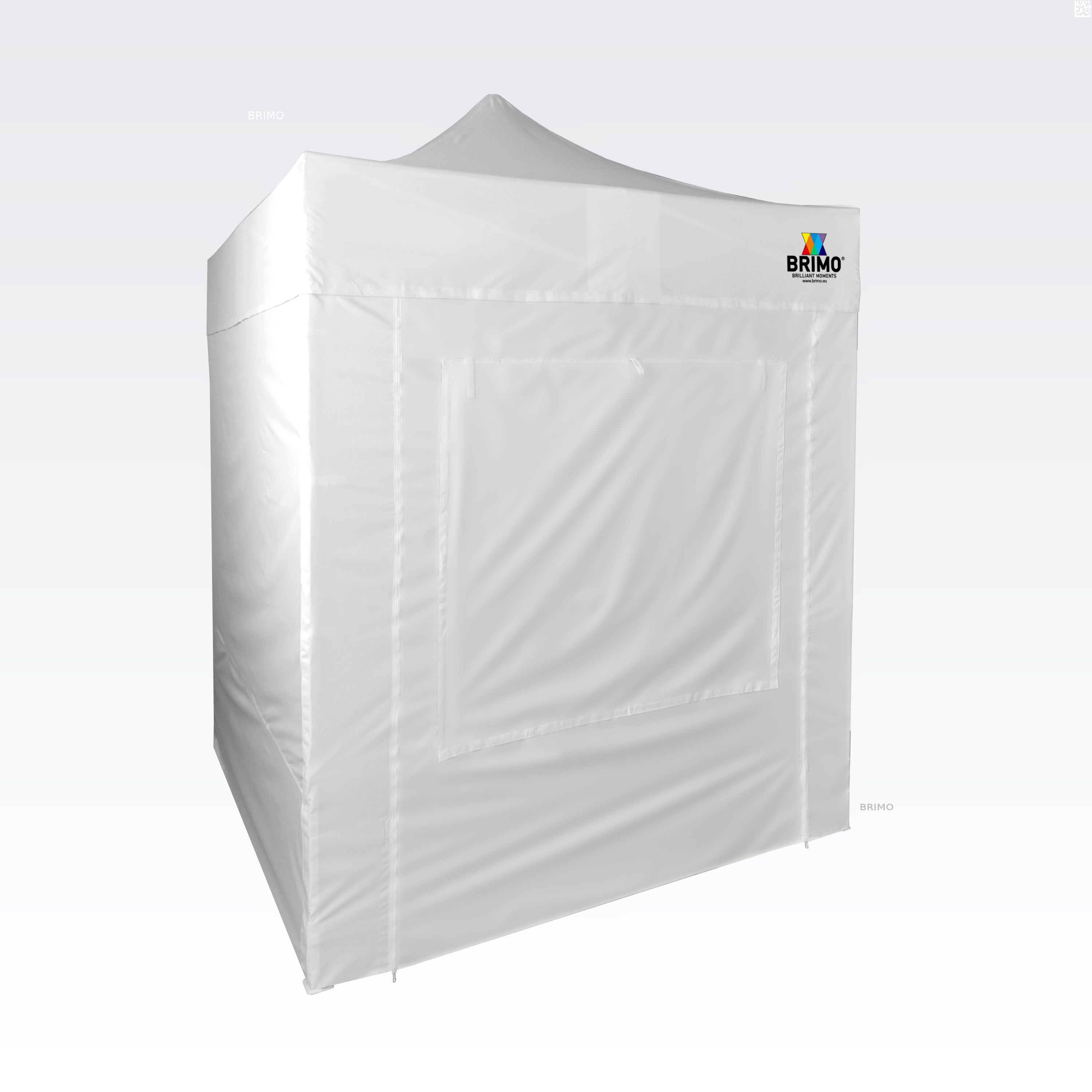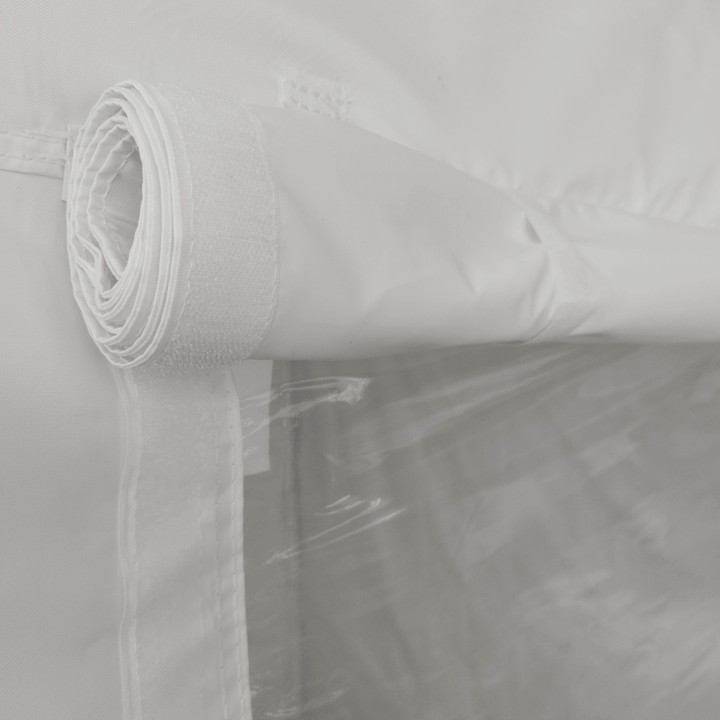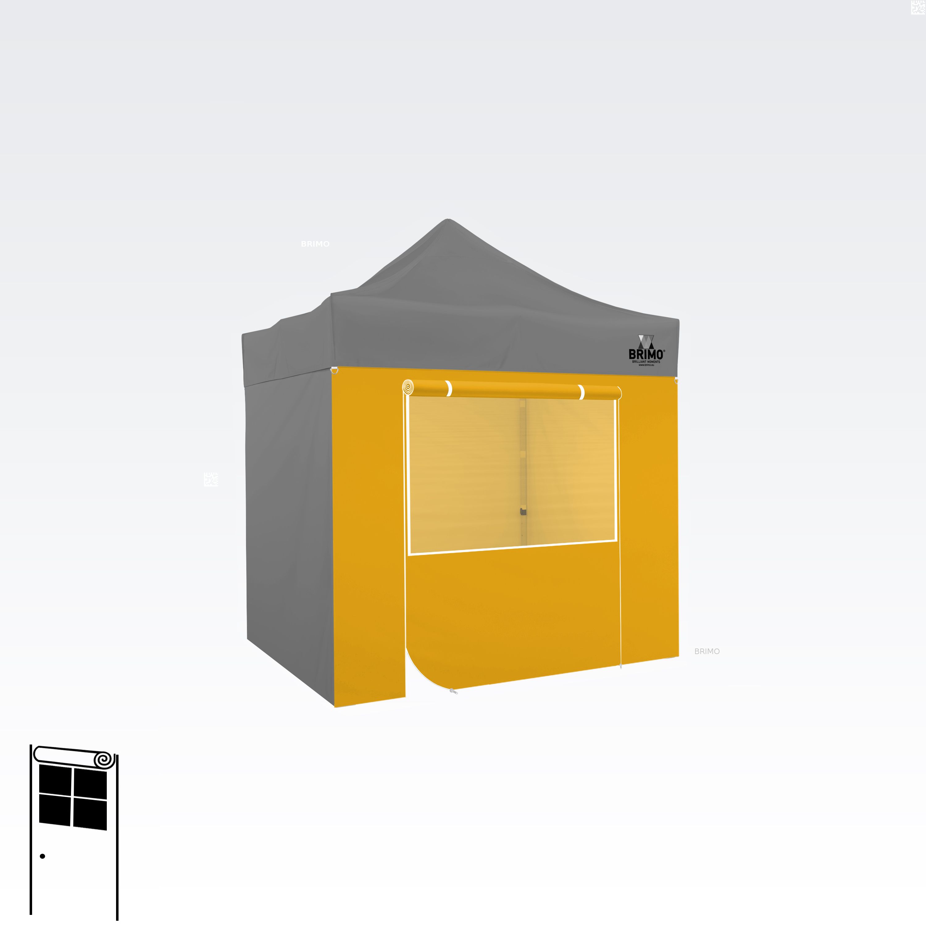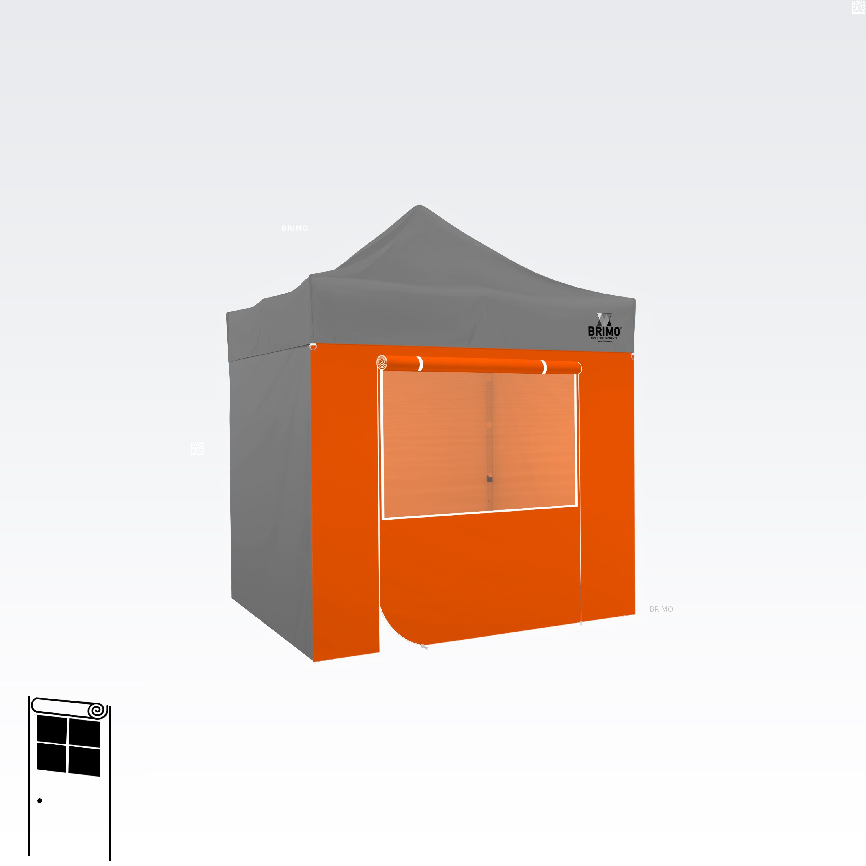 A porta com fecho de correr permite uma entrada fácil na tenda. No lugar della porta existe uma janela em PVC, pela qual entra luz suficiente na tenda, mesmo quando esta está fechada. Também é possível fechar a janela de PVC com o tecido na cor da parede, criando assim uma parede inteira. Cada parede é fixada ao tejadilho com um velcro de 5 cm. A montagem da parede lateral não demora muito tempo. A parede é utilizada principalmente durante o mau tempo. Sob a tenda, terá um lugar seguro e seco. O material da parede é o mesmo das restantes lonas.