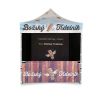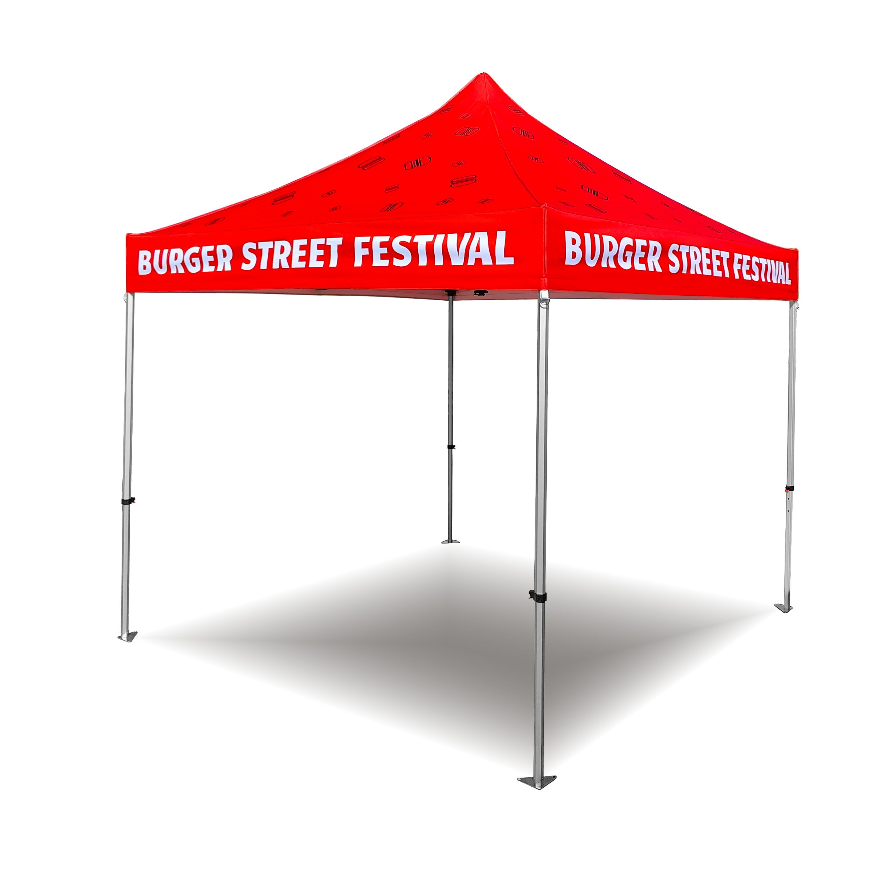 Tendas publicitárias com impressão digital por sublimação. A impressão é realizada por meio de um processo químico no qual a tinta penetra diretamente na estrutura do tecido devido ao calor. Logotipo, texto ou qualquer outro tipo de gráfico na parte interna ou externa da tenda de acordo com o desejo do cliente.