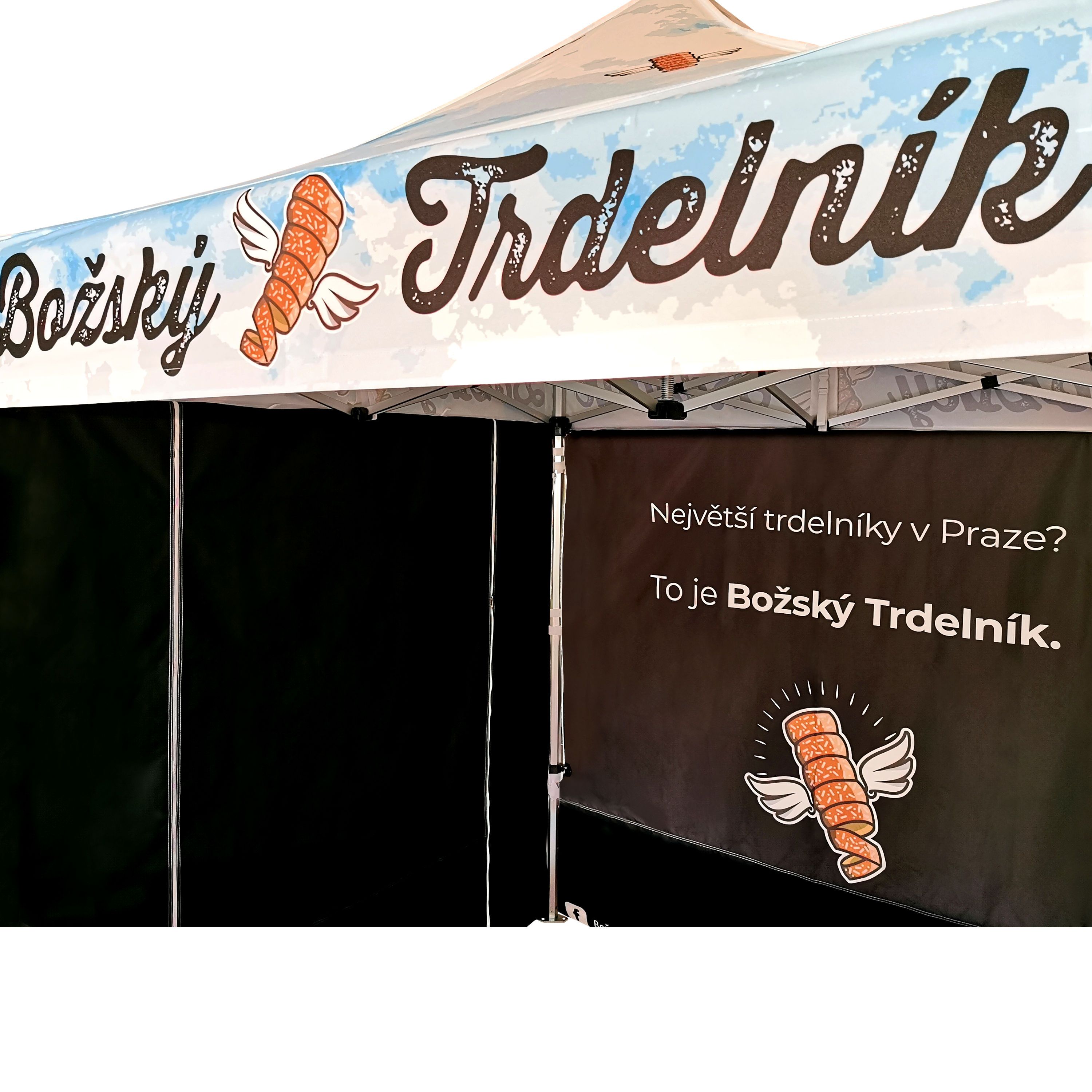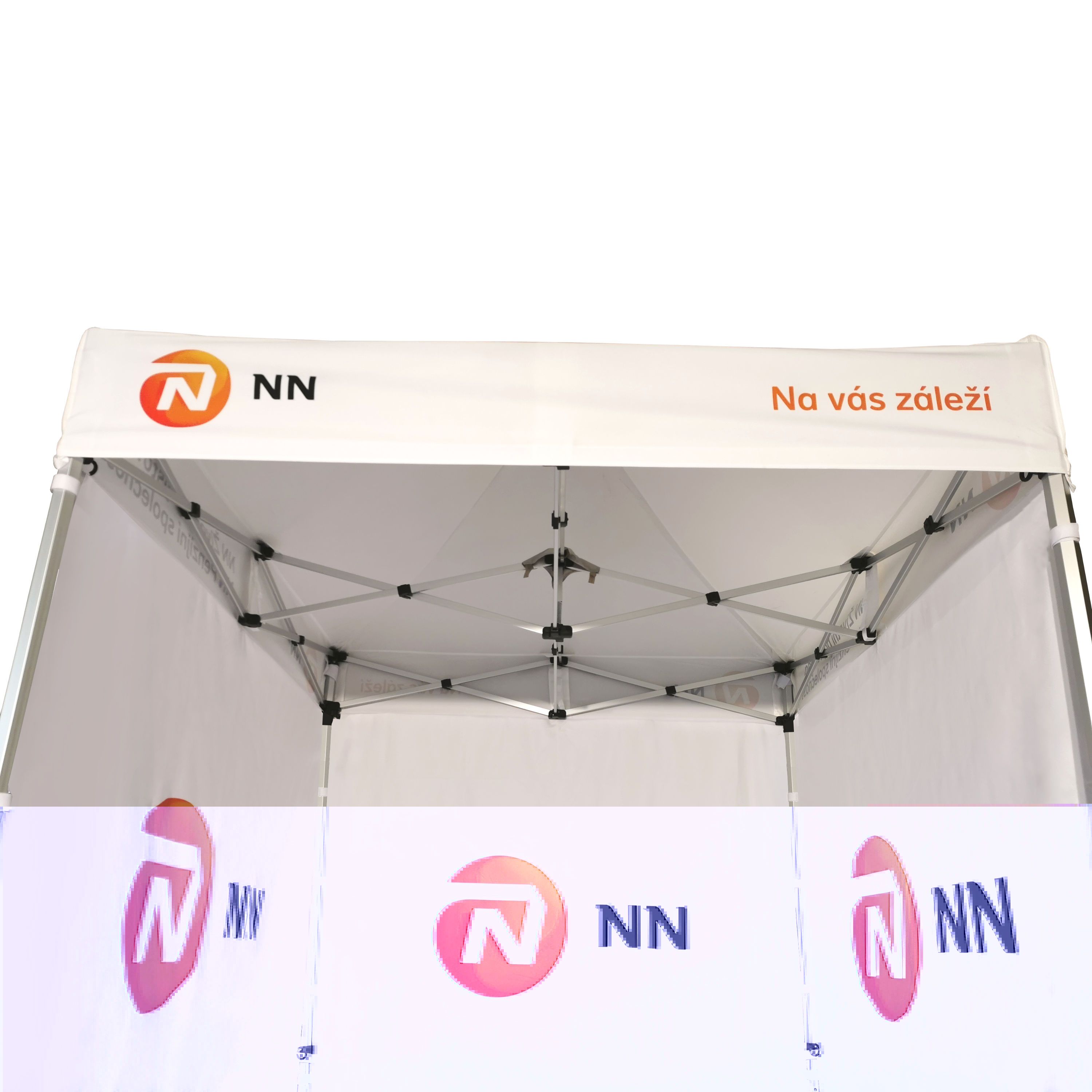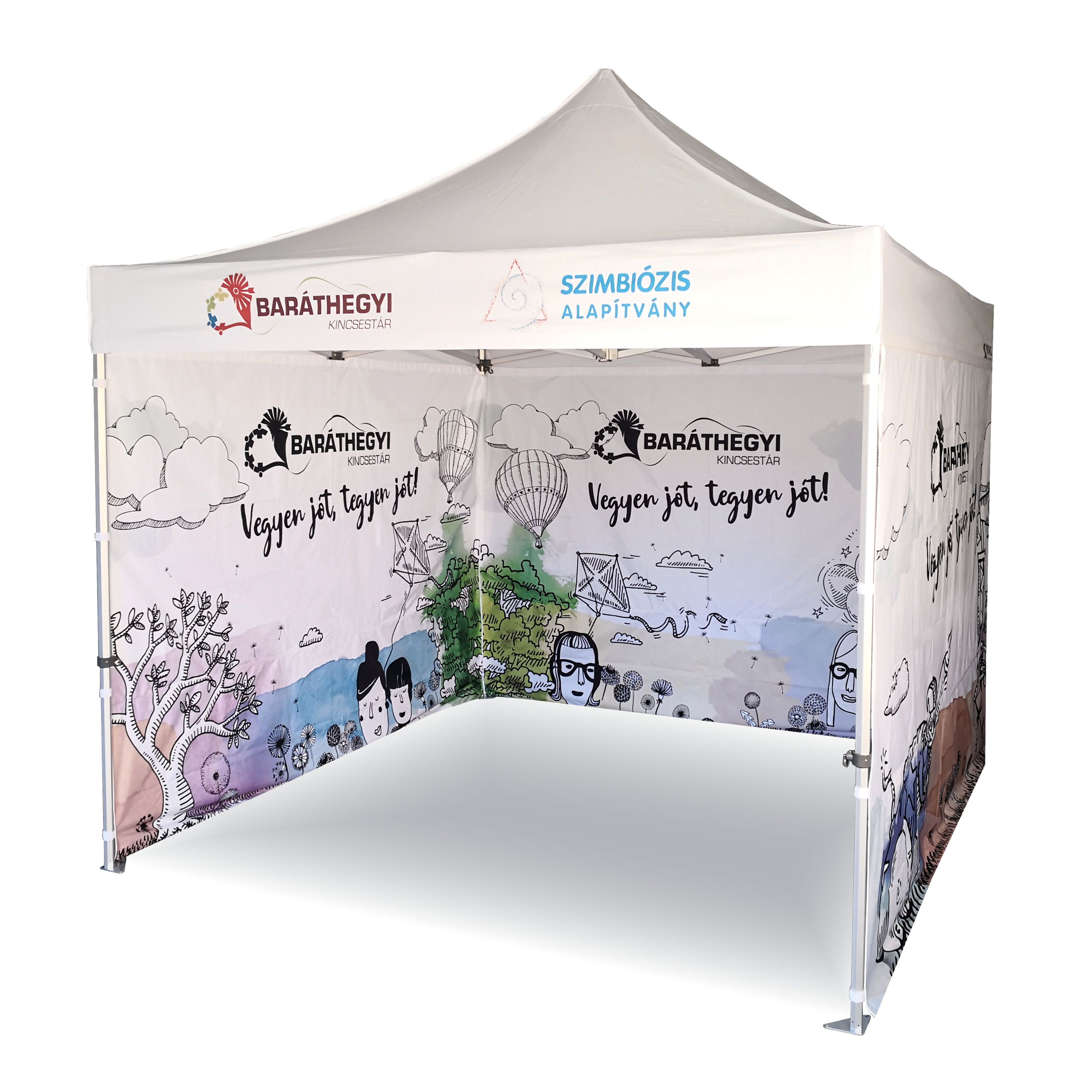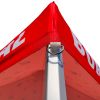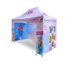 Tendas publicitárias com impressão digital por sublimação. A impressão é realizada por meio de um processo químico no qual a tinta penetra diretamente na estrutura do tecido devido ao calor. Logotipo, texto ou qualquer outro tipo de gráfico na parte interna ou externa da tenda de acordo com o desejo do cliente.