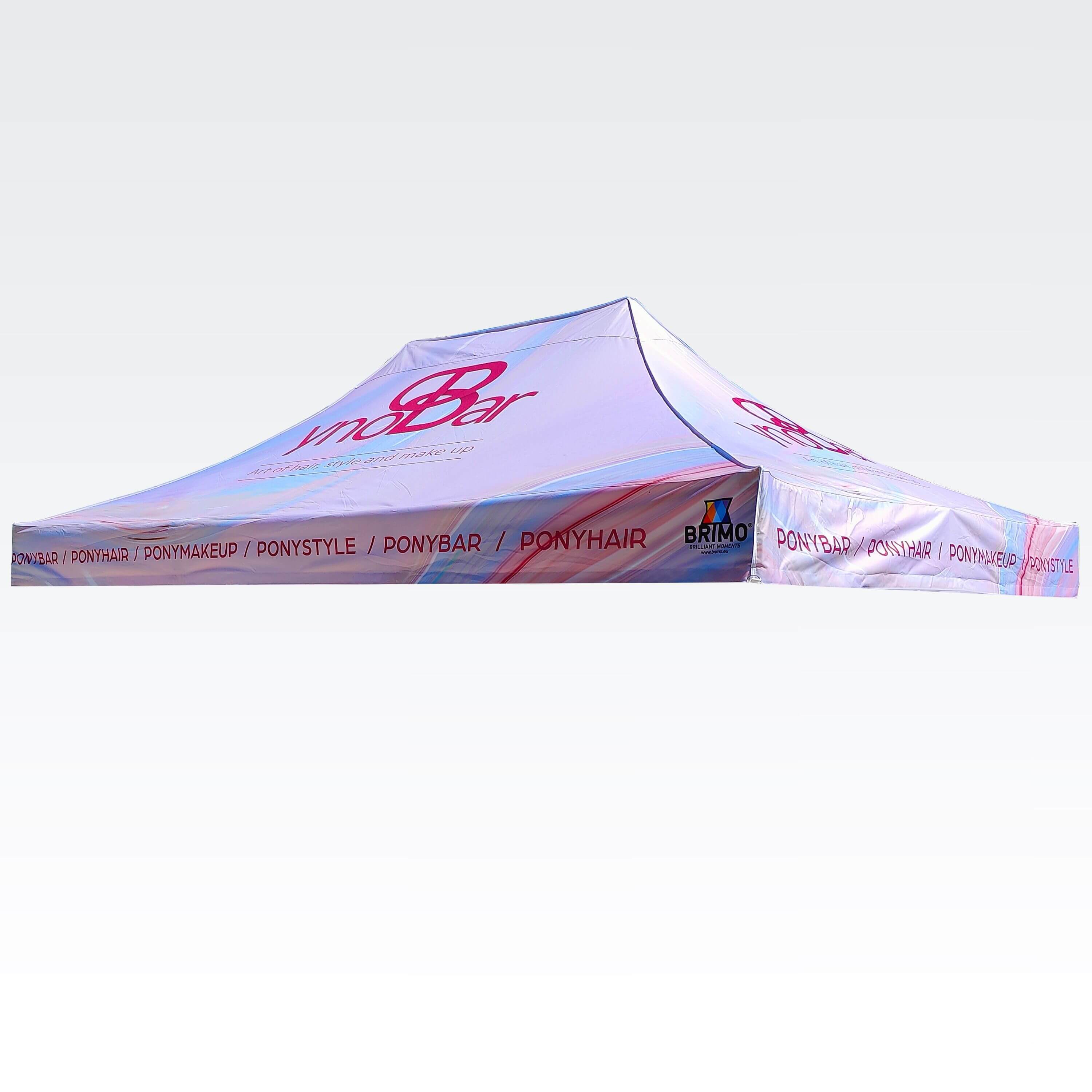 As cores são extremamente vivas, esse método reflete perfeitamente todos os detalhes da tenda publicitária. As cores brilhantes atraem atenção, e a sublimação garante longa durabilidade sem desbotamento. Nesse método, o preço permanece o mesmo independentemente do tamanho da impressão (o tamanho da impressão não afeta o preço, o preço da parede ou do teto permanece o mesmo). Quanto maior a impressão, mais visível será a publicidade.