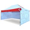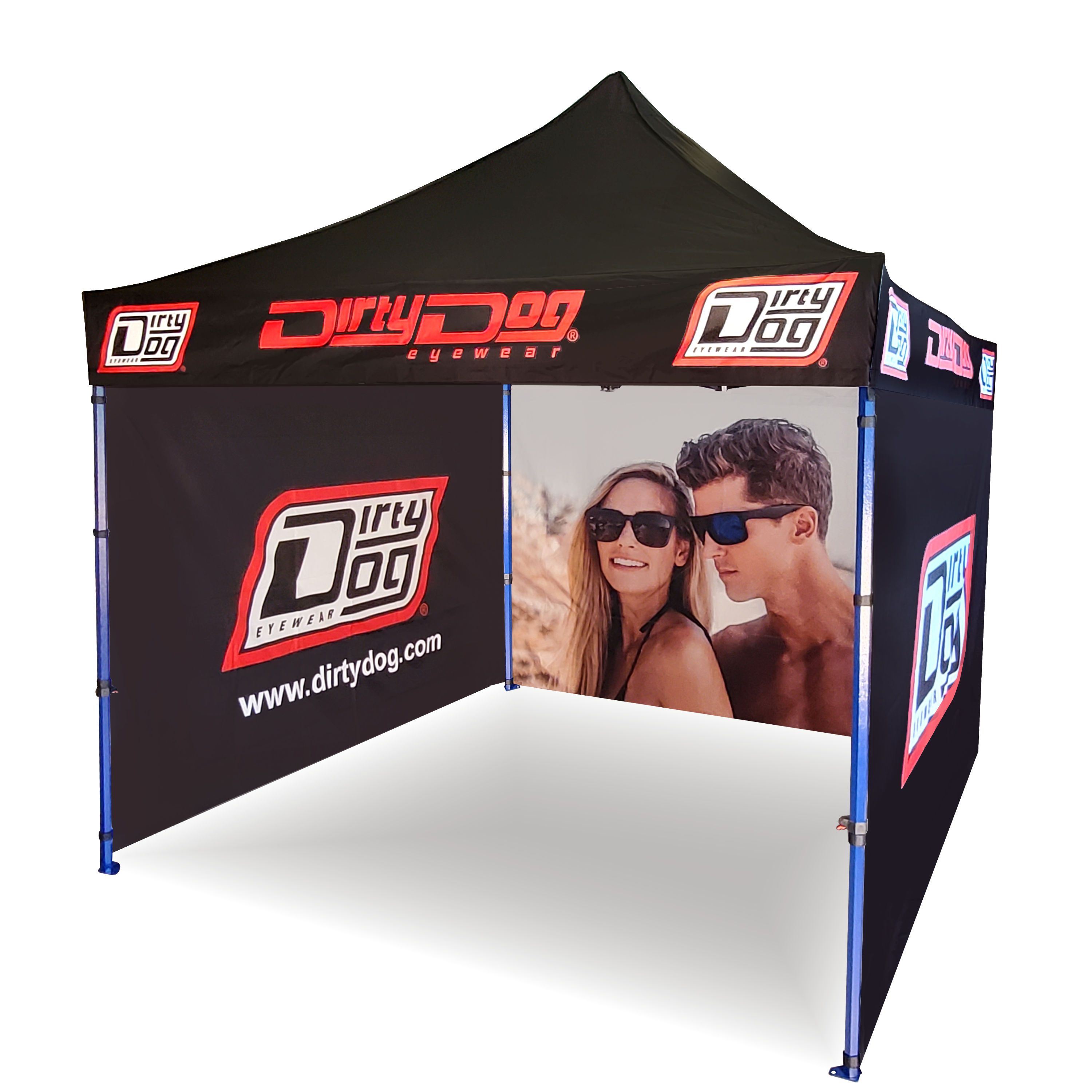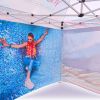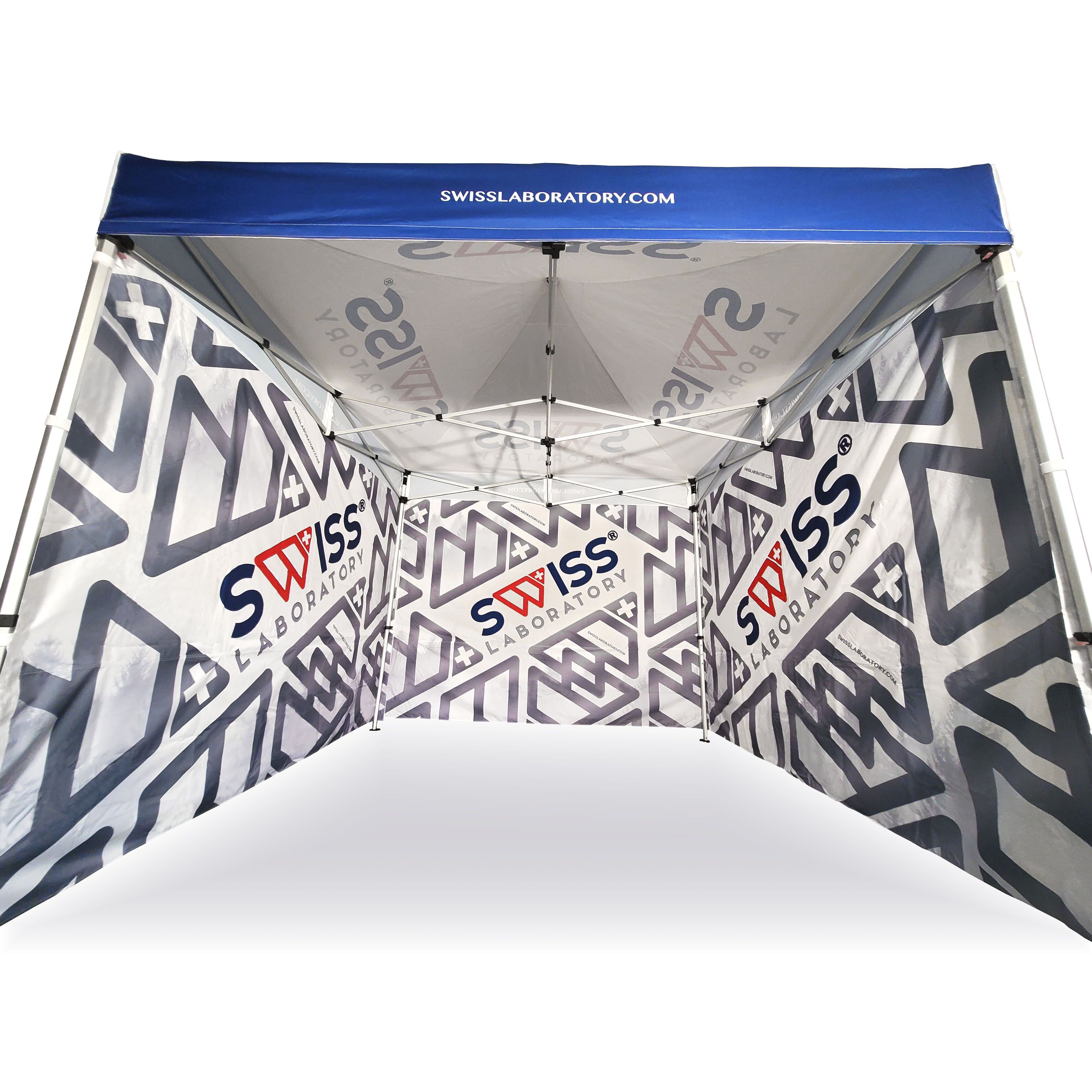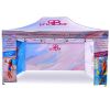 Tendas publicitárias com impressão digital por sublimação. A impressão é realizada por meio de um processo químico no qual a tinta penetra diretamente na estrutura do tecido devido ao calor. Logotipo, texto ou qualquer outro tipo de gráfico na parte interna ou externa da tenda de acordo com o desejo do cliente.