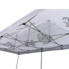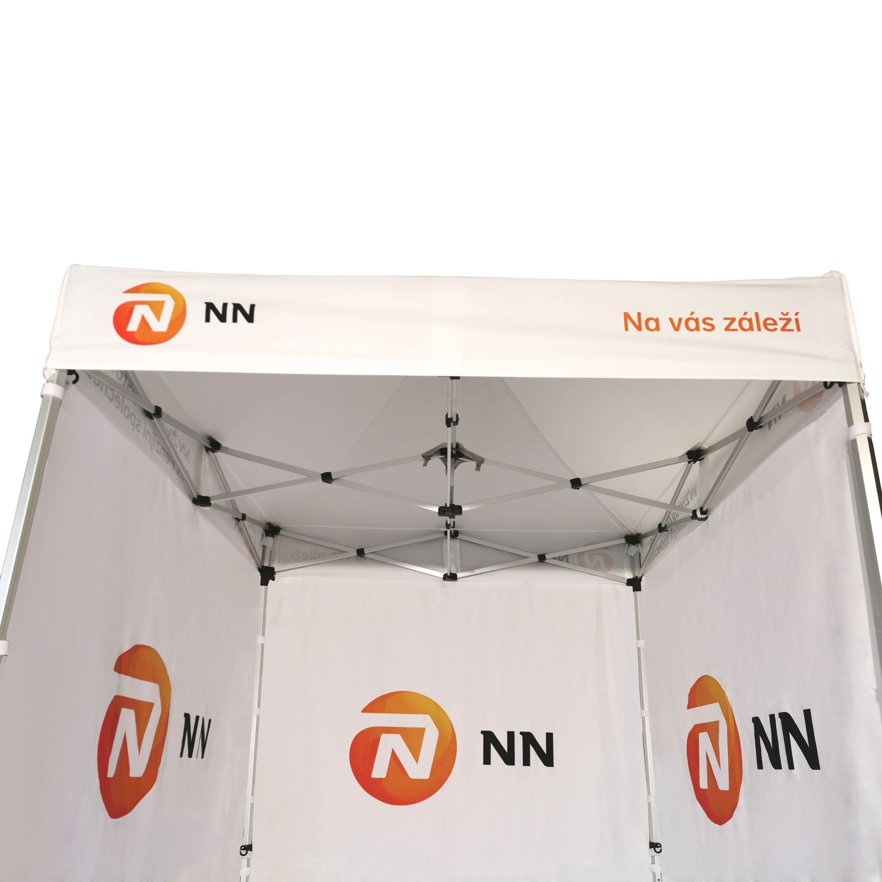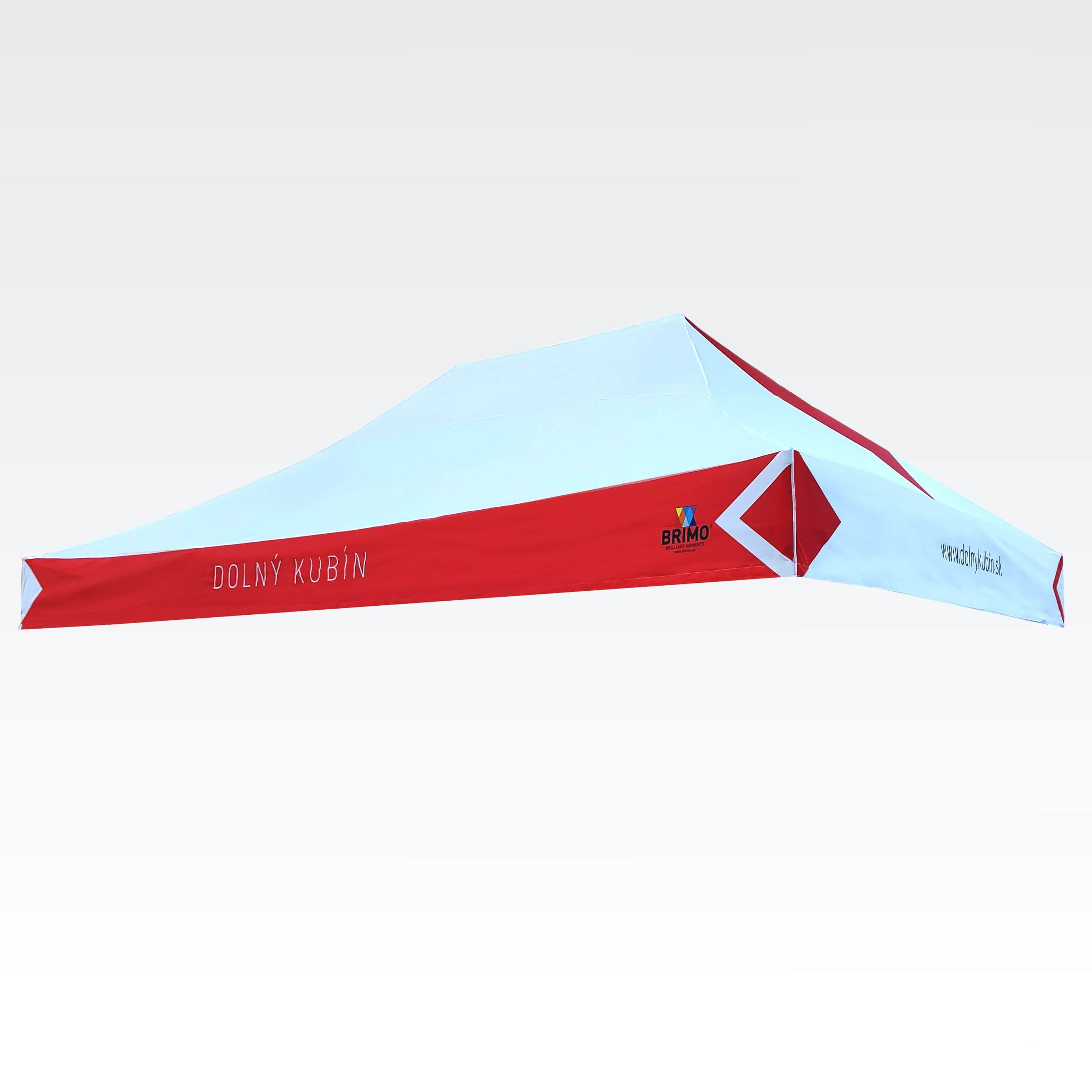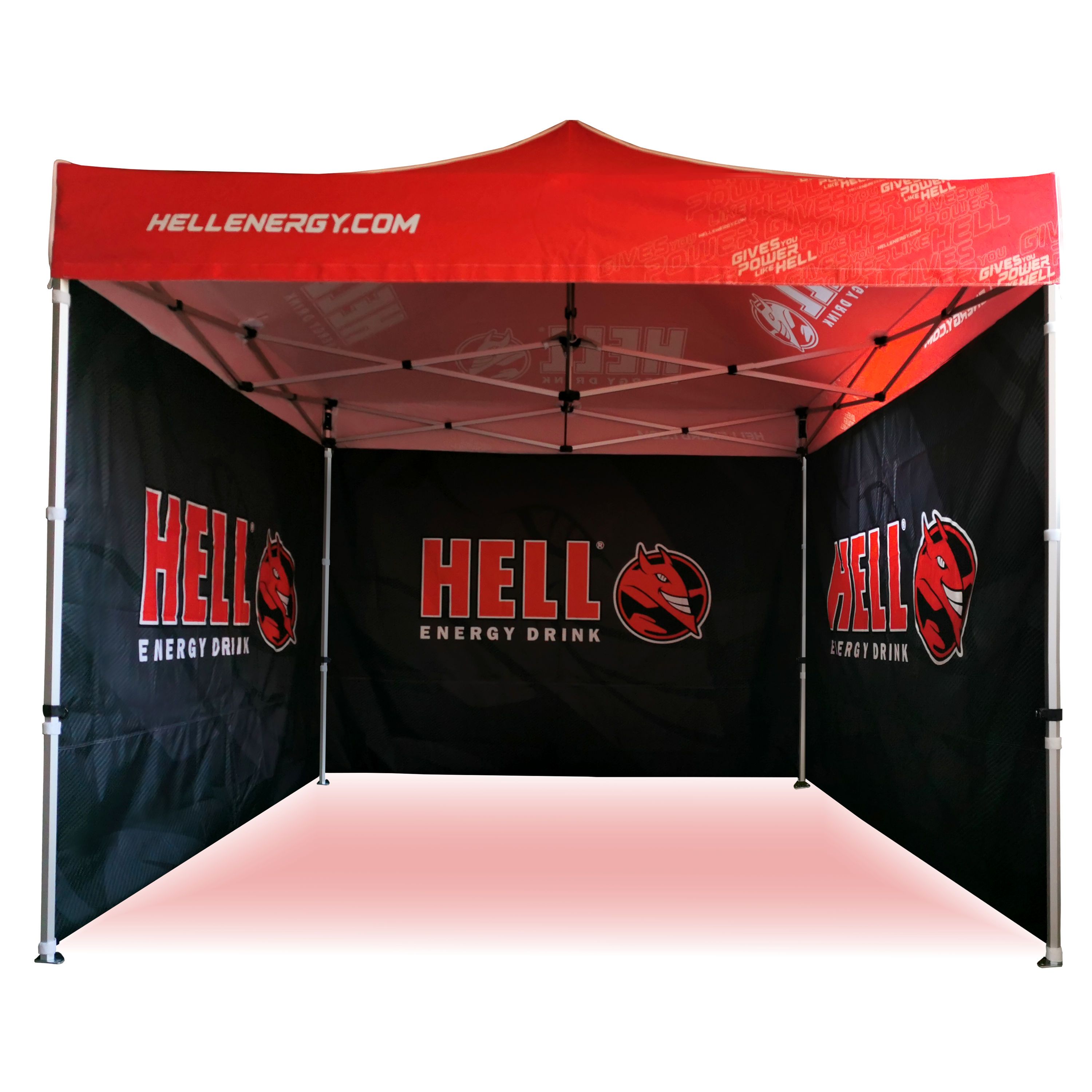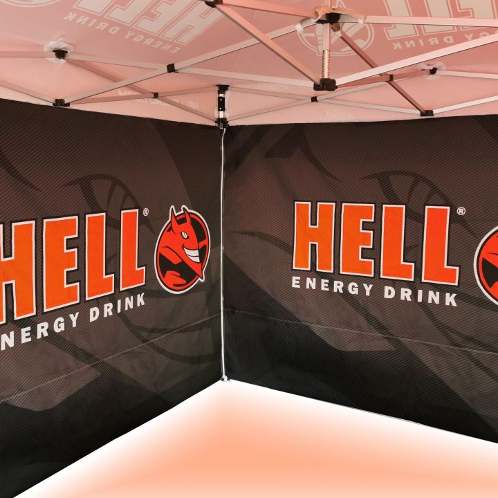 Tendas publicitárias com impressão digital por sublimação. A impressão é realizada por meio de um processo químico no qual a tinta penetra diretamente na estrutura do tecido devido ao calor. Logotipo, texto ou qualquer outro tipo de gráfico na parte interna ou externa da tenda de acordo com o desejo do cliente.