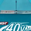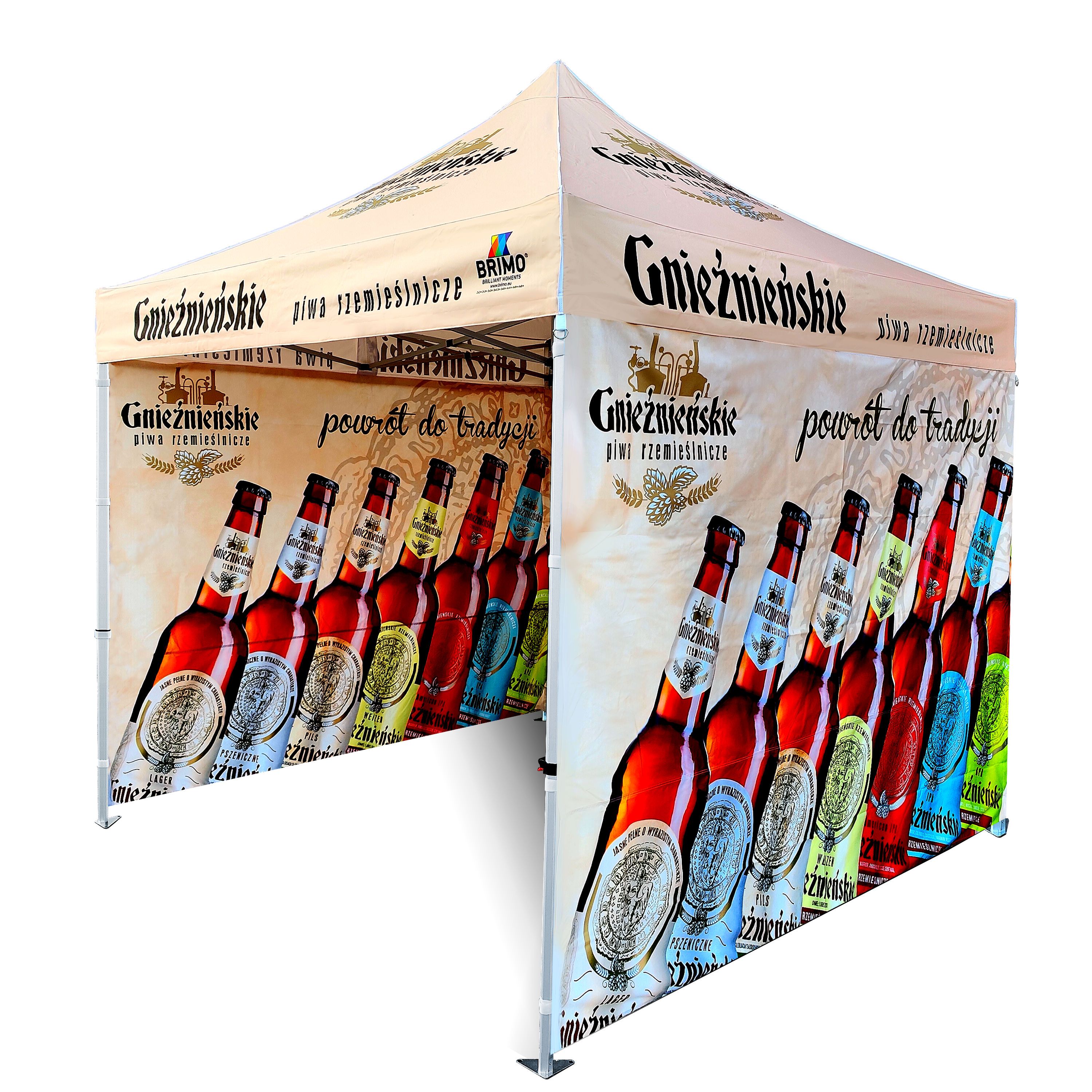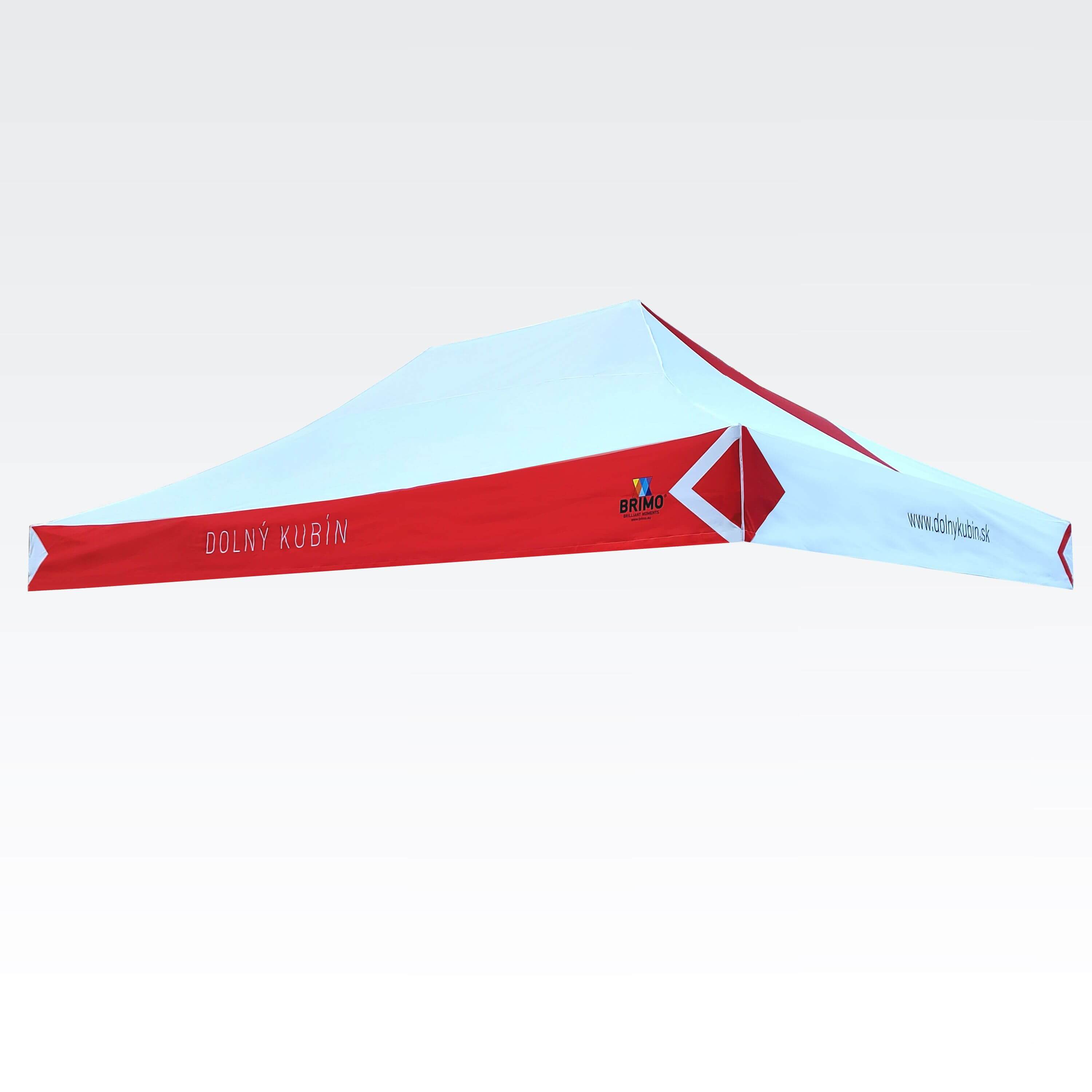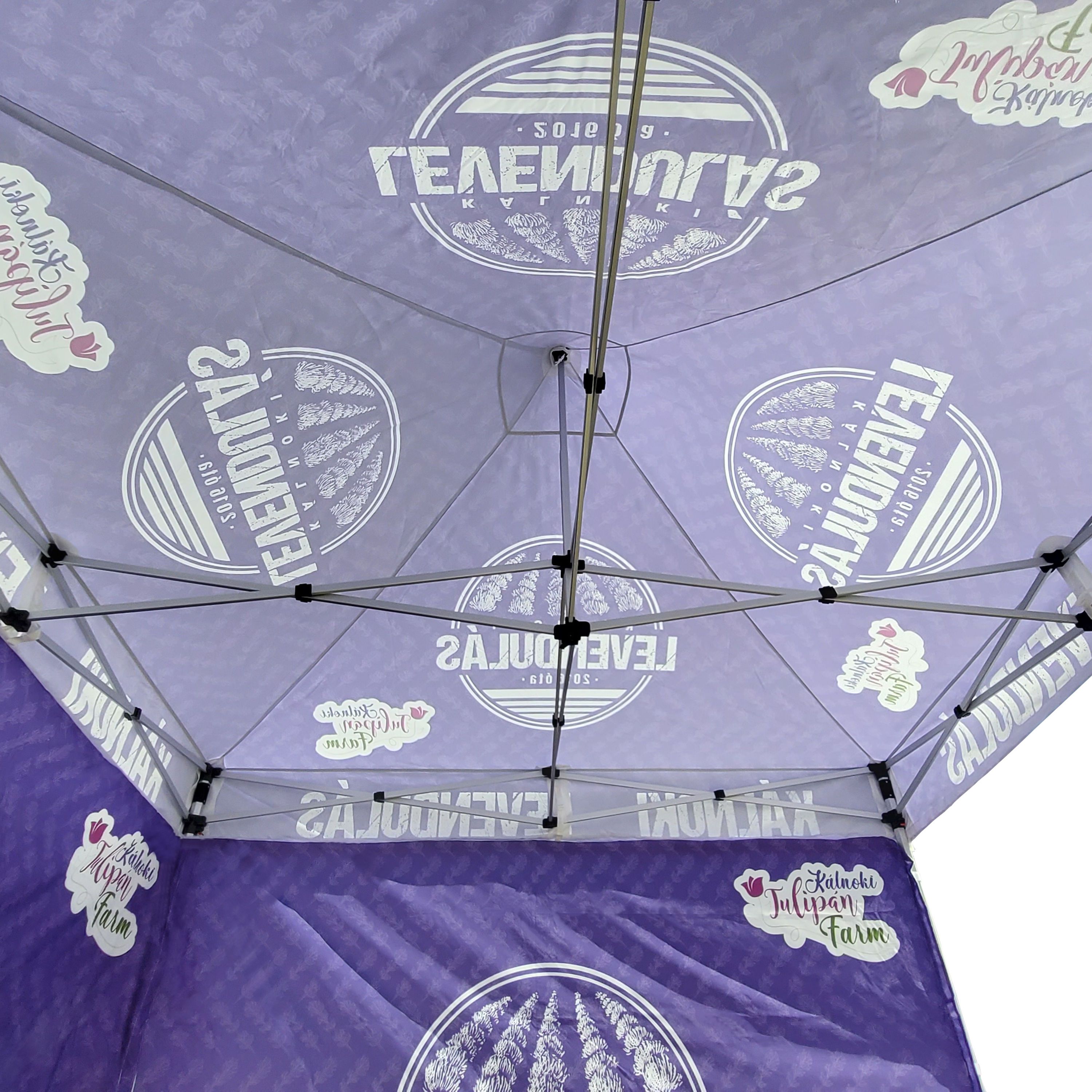 Tendas publicitárias com impressão digital por sublimação. A impressão é realizada por meio de um processo químico no qual a tinta penetra diretamente na estrutura do tecido devido ao calor. Logotipo, texto ou qualquer outro tipo de gráfico na parte interna ou externa da tenda de acordo com o desejo do cliente.