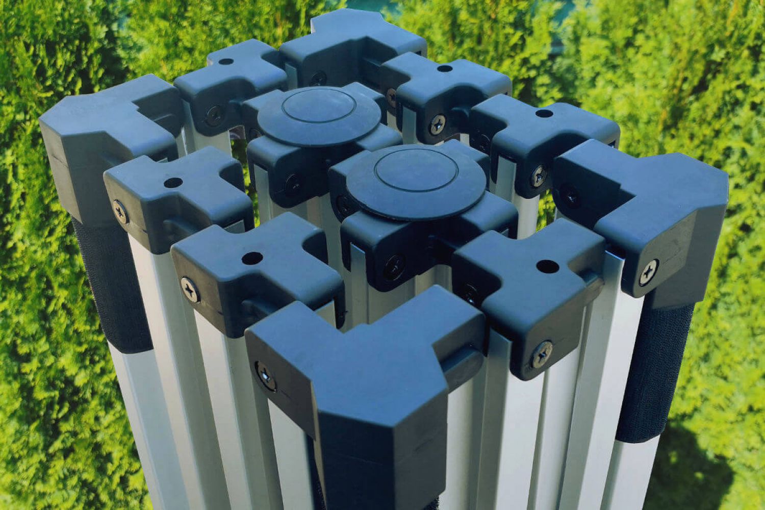 Esqueça os manuais de montagem complexos. As ligações aparafusadas e o mecanismo de tesoura permitem a montagem da tenda num minuto sem o uso de qualquer ferramenta. Todos os componentes são feitos de polímeros duráveis e resistentes ao impacto. As pernas de alumínio têm paredes reforçadas e perfil hexagonal, o que lhes confere uma estabilidade muito superior aos perfis quadrados baratos. Embora o alumínio seja leve, utilizamos mais material nas nossas tendas para atingir uma resistência comparável às estruturas pesadas de aço.