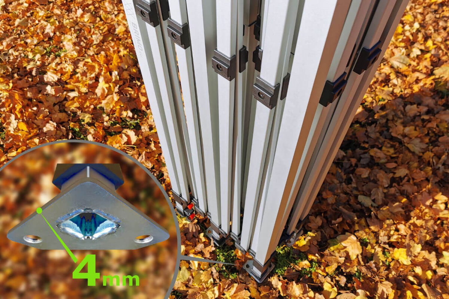 A tenda publicitária pode ser usada tanto ao ar livre quanto em ambientes internos. Não negligencie a segurança da tenda. Deve sempre ser ancorada em qualquer condição climática. O pacote contém estacas para fixação. Se você montar a tenda em uma superfície dura, pode usar pesos de aço ou sacos de areia. Como fixação adicional, os clientes utilizam corda com estacas, também disponíveis como acessórios para a tenda.