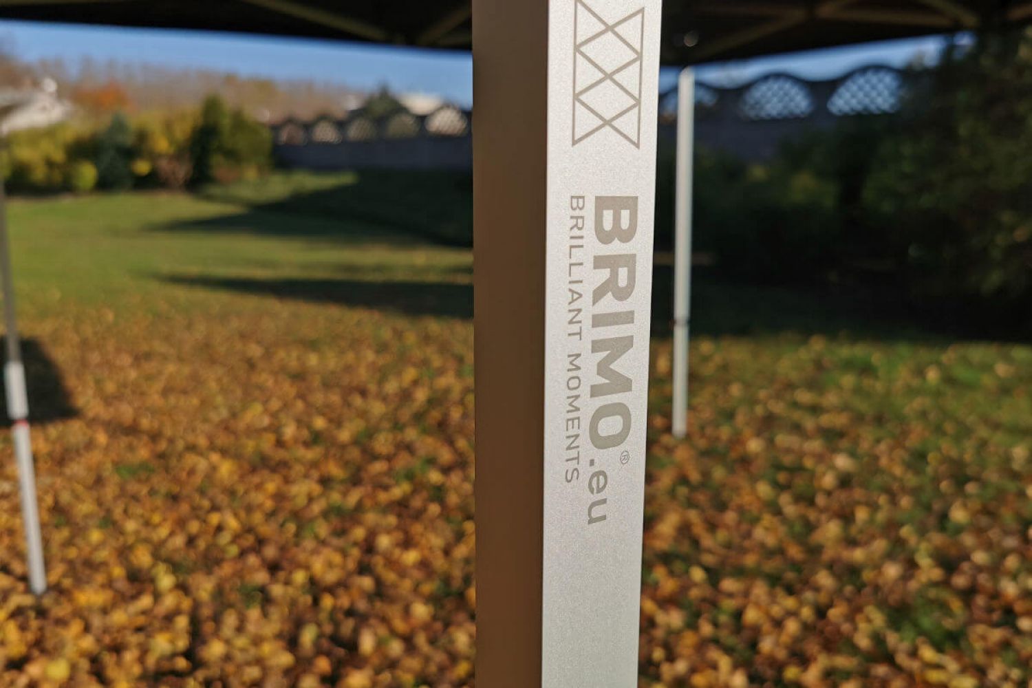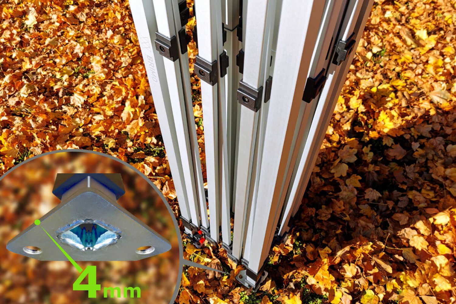 Fabricamos as lonas em 7 cores diferentes. Não fazemos distinção nos materiais, todas as lonas são idênticas. A qualidade do teto é a mesma que a das paredes adicionais. Focamos na qualidade para que os clientes fiquem satisfeitos com o produto. A estrutura é de alumínio com elementos de conexão pretos.