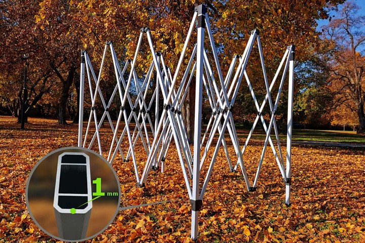 O material mais usado é o alumínio. Possui propriedades incríveis: baixo peso, mas alta resistência e confiabilidade. O peso leve é apreciado se você frequentemente vende sob a tenda e precisa transportá-la. A tenda abre-se e fecha-se em segundos.